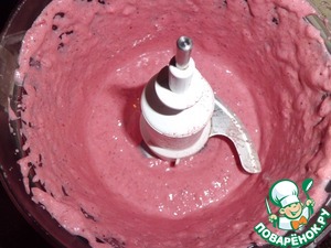 Первую часть взбиваем в комбайне с клубникой. У меня была замороженная, поэтому я её размораживала предварительно, что бы убрать лишнюю жидкость. Убираем в холодильник, пока подготавливаются остальные слои.