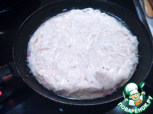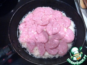 Смазываем сковороду маслом, выкладываем половину спагетти с яичной смесью, сверху - ломтики копченой колбасы.