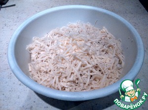 Остывшие макароны посолите, поперчите по вкусу, добавьте тертый сыр и перемешайте.