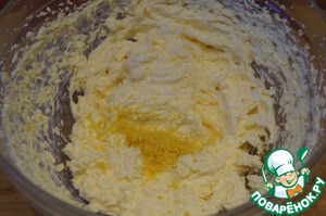 Взбить масло c сахаром, пока не получится лёгкая, однородная масса, добавить яйцо и желток, хорошо перемешать.