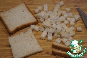 Разрезать хлеб на кубики, замочить в молоке. Отставить.