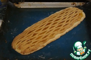 Покрыть пирог полосками теста в одном направлении. Затем через одну отогнуть полоски до половины пирога и положить одну полоску поперек предыдущих.