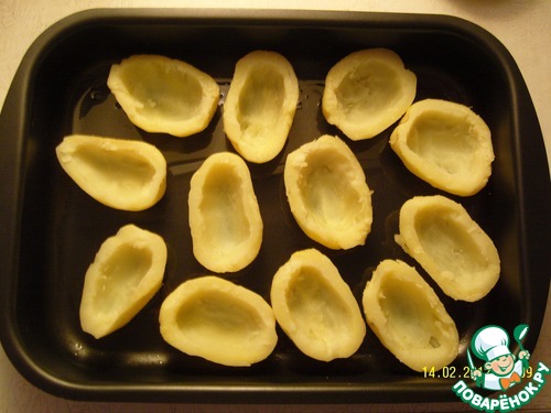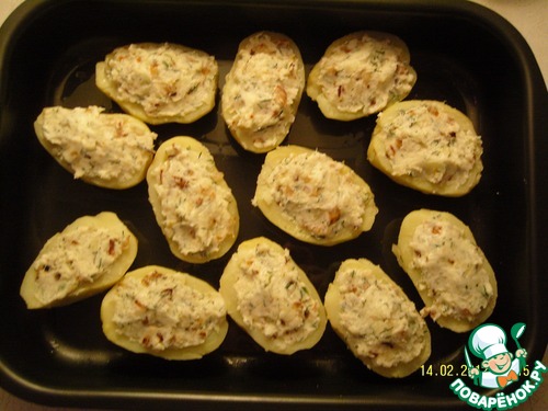 4) Половинки картофеля чуть присолить и заполнить приготовленной массой.