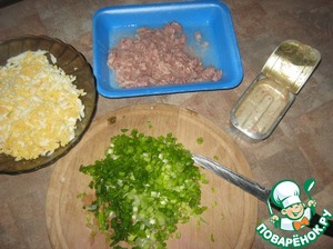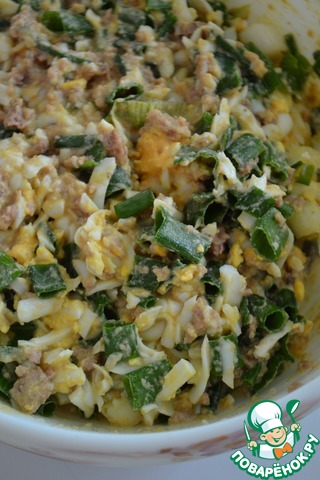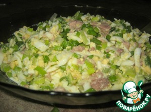 Яйца натираем на крупной тёрке, лук режем мелко-мелко.