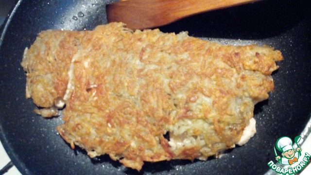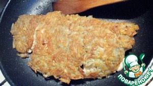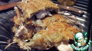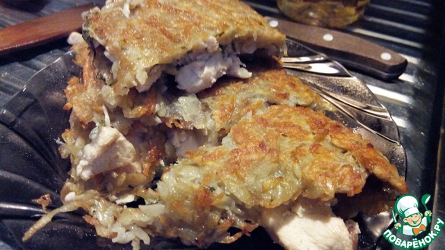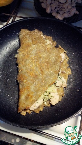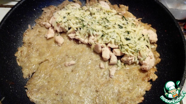 Соломкой режем филе и грибы, обжариваем на сковороде минут 10-15, можно без масла. Трём сыр и мелко рубим зелень, смешиваем. Чистим и натираем картошку, выжимаем, добавляем яйцо, муку, солим, перчим по вкусу. Выкладываем на разогретую сковороду с маслом тонким слоем картофельное тесто, жарим до образования румяной корочки, переворачиваем.