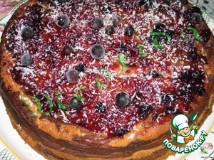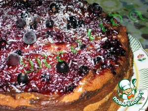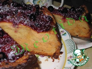 Очень сочный и нежный пирог, состоящий из нескольких слоев: из сметанного теста с белым шоколадом и из творожно-йогуртного с бананом.. сверху немного красно-черно смородинового джема, кокосовая стружка и черная смородинка..