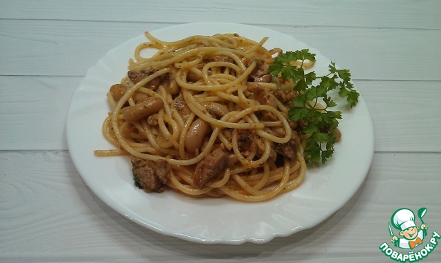 На сковороду отправляем печень трески, фасоль, томатный соус, мелко нарезанную зелень, прогреваем. После добавляем туда спагетти, солим, перчим, перемешиваем и снова прогреваем..
