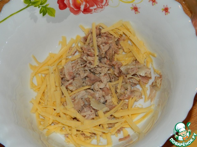 Куриное мясо режем на кусочки, добавляем тертый сыр.