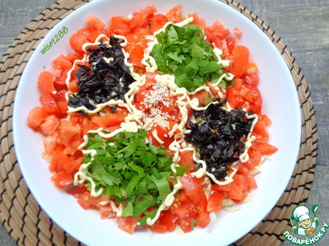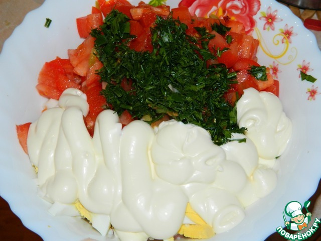Добавляем порезанные помидоры и зелень. Заправляем салат майонезом и подаем к столу.