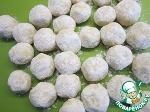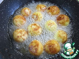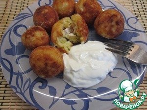 Отделяя порционные кусочки от картофельного теста, сформировать пончики, пряча в серединку сюрприз - кусочки куриного филе.