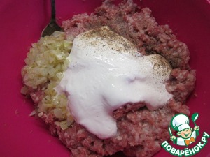 Фарш с рисом+соль+перец+0,5 стак. сметаны+обжаренный лук =