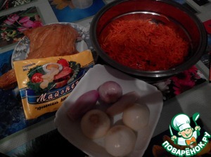 Подготавливает нужные продукты, корейскую морковку берем уже готовую домашнюю или покупную, у кого какая есть;чистим лук