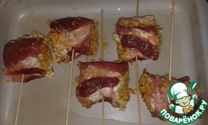 Свернуть рулетиком и сколоть зубочисткой (у меня они закончились, использовала шпажки). Выложить на смазанный маслом противень