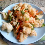 Всю эту красочную овощную смесь выкладываем сверху на капусту. Посыпаем специями, солим. Сверху чесночок. Масло к этому времени накалилось, заливаем (здесь будьте осторожны! брызгается! ) овощи, брызгаем уксусом.