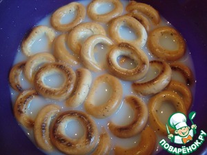 Замачиваем сушки в молоке (можно молоко+вода) для набухания-смягчения, периодически переворачивая.