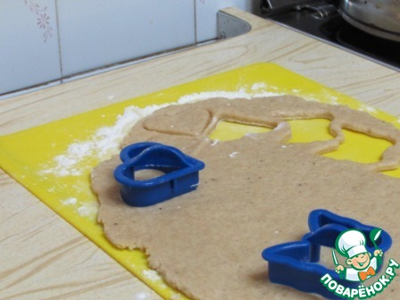 На присыпанной мукой поверхности раскатать тесто толщиной 0,5 см и вырезать формочками для печенья фигурки. Присыпать молотым миндалем с сахаром. -