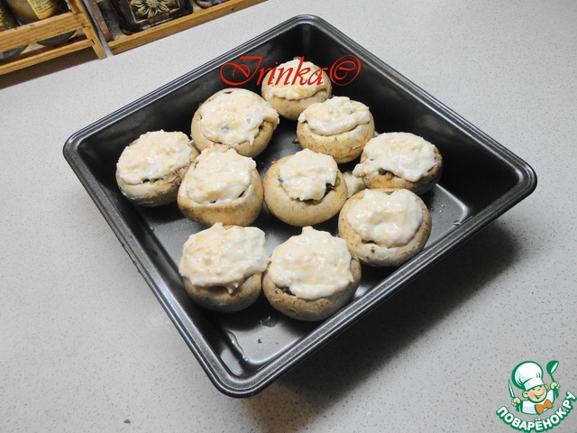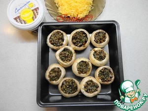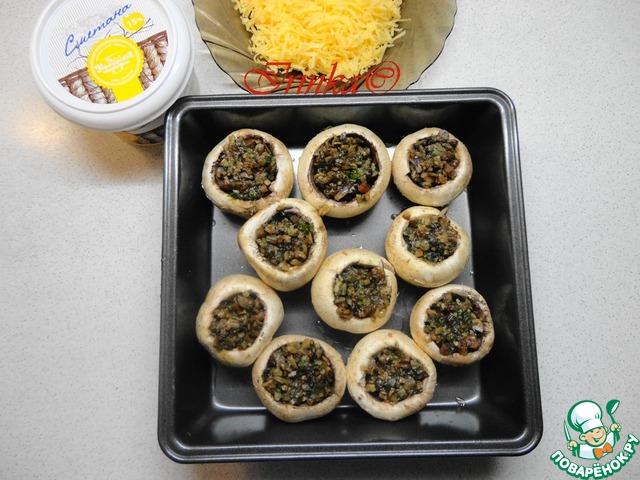 Сметану смешиваем с тертым сыром и выкладываем эту массу поверх начинки на грибы, делая небольшой купол.