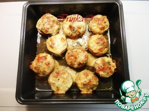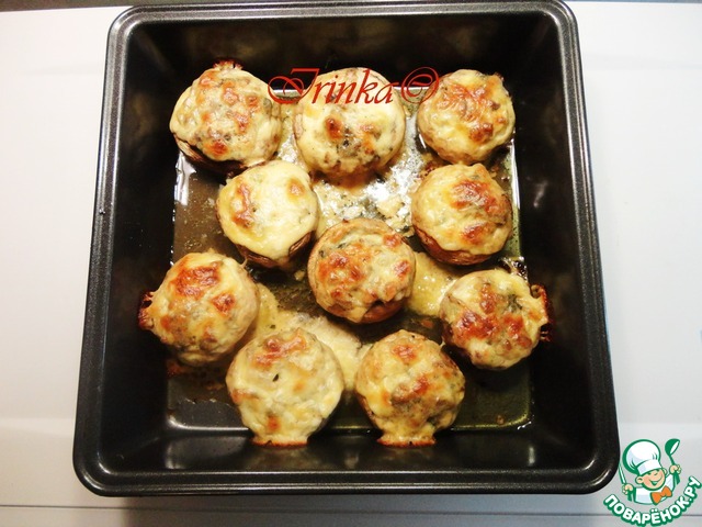 Форму для запекания смазываем маслом, выкладываем в нее подготовленные шляпки отверстием вверх.