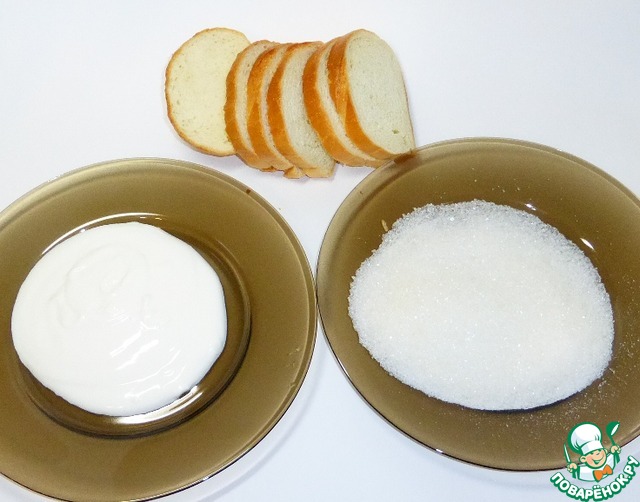 Приготовим продукты: батон, тарелка со сметаной, тарелка с сахаром.
