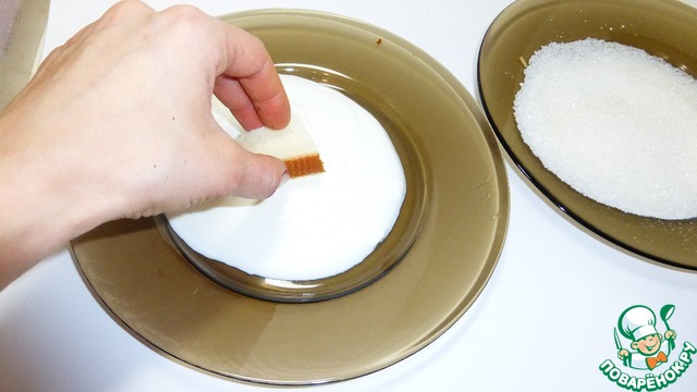 Обмакиваем только одну сторону. Сторона с сахаром будет наверху, а стороной без сахара кладем на противень -