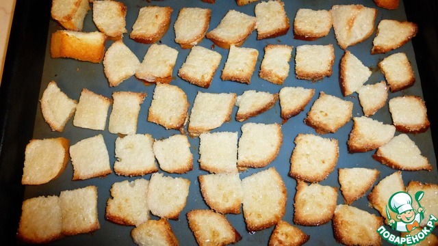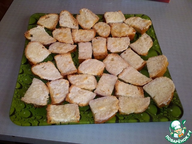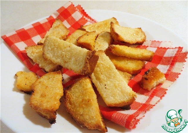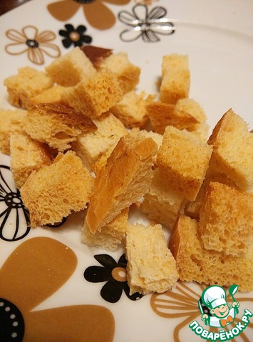 Кусочки батона порежем крупно. Я режу так: вдоль и на три части. То есть, каждый кусочек на шесть частей.
