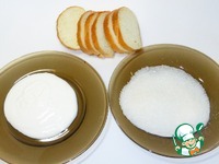 Приготовим продукты: батон, тарелка со сметаной, тарелка с сахаром. |