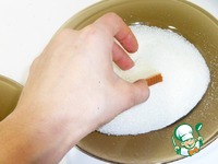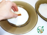 Потом в сахар. Обмакиваем только одну сторону. Сторона с сахаром будет наверху, а стороной без сахара кладем на противень |