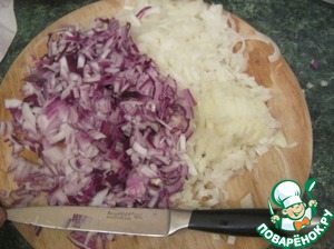 Мелко рубим лук (красный и белый) и маринуем минут 5-10 в смеси для маринада-как указано в ингридиентах