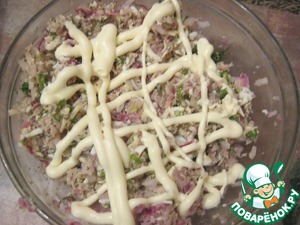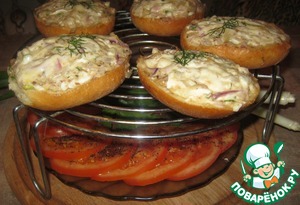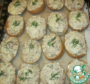 Слегка смазать майонезом, украсить укропом и на 10 минут в духовку (температура 180 градусов)