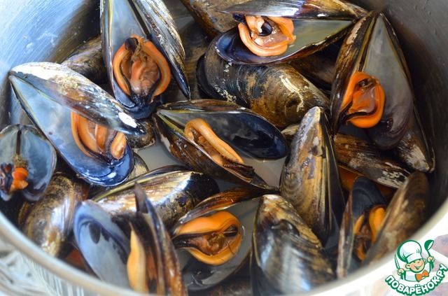 1. У мидий удалить «бородку» и хорошенько потереть их металлической щеткой.