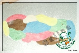 • Покрасить в разные цвета. Несколько жгутиков уложить рядом и раскатать скалкой в широкую ленту.