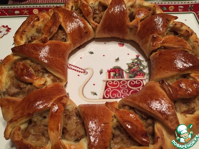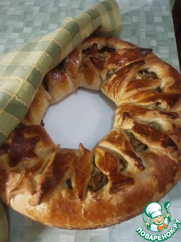 Выстелить форму тестом таким образом, чтобы оно заходило на бортики. Выложить кольцом начинку. Прикрыть краями теста.