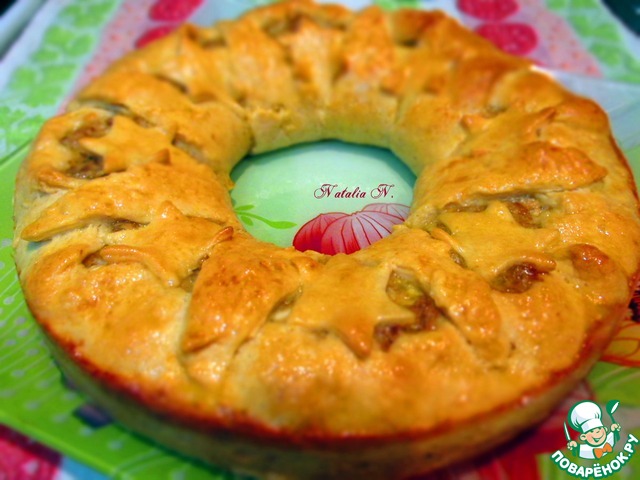 Все лучики поднять, немного вытянуть, завернуть их на начинку и закрепить на тесте. Для лучшего скрепления можно смазать кончики лучиков белком.