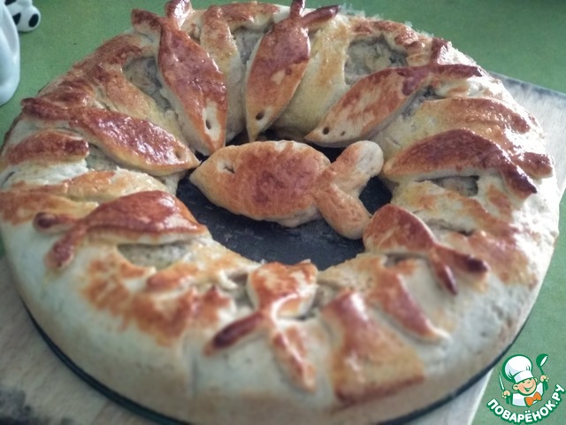 Из оставшегося тесто вырезать рыбок и разложить на пироге. Смазать желтком и по желанию посыпать кунжутом, дать подойти 20 минут.