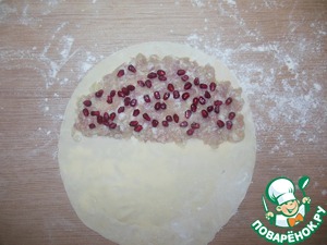 На половинку раскатанного теста выкладываем фарш, посыпаем его зёрнами граната. Ой, забыла написать про фарш. Фарш в кутабы кладут бараний, но, можно и говяжий. Его посолить, добавить чёрного перца и лука (на тёрку или вместе с мясом на мясорубку)