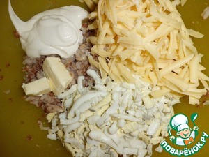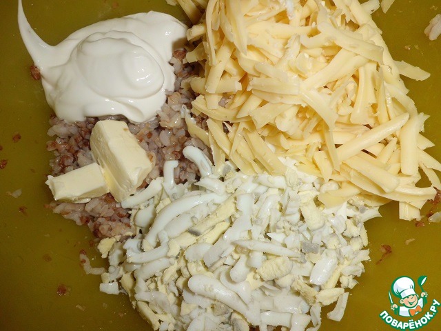 Готовую кашу немного остужаем, солим и добавляем: яйца и сыр, натертые на крупную терку, сливочное масло, сметану и перец.