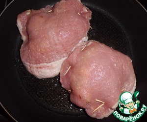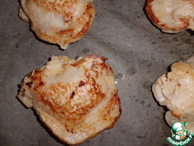 Скрепляем края зубочистками и отправляем на раскаленную сковороду. Обжариваем с двух сторон на самом большом огне, до румяной корочки.