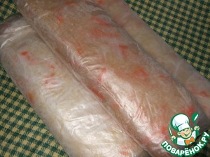 В большую стеклянную миску откладывать порцию капусты, присыпать солью и немного ее, капусту, перетереть ("пожамкать") рукой - до выделения сока. Не переусердствовать! - отжимать сок не надо.