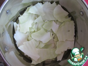 С качана оборвать наружные листья и уложить их на дно 5-литроваой кастрюли.