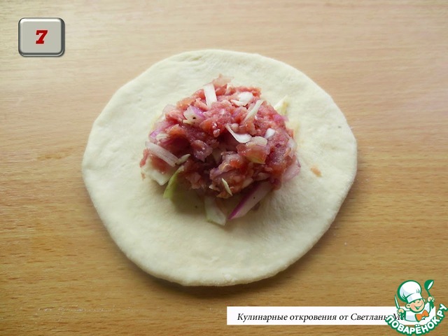 Начинаем лепить пигоди. На самом деле это гораздо проще, чем лепить манты. Для этого тесто раскатываем и делим на 20 частей. Из каждой части раскатываем круглую лепешку. В середину выкладываем начинку