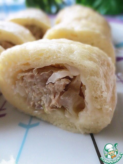 Если лень лепить пирожки, можно сделать рулет с той же начинкой. Для этого раскатать тесто, выложить фарш (рубленое мясо), слепить края. Рулет собрать в кольцо.