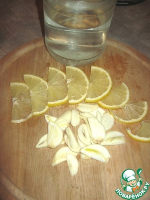 Чеснок режем на тонкие пластины, лимон на тонкие полукольца, всё это добавляем в остывшую воду и ставим в тёмное место на 4 суток.
