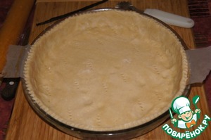 Тесто раскатать и выложить им дно и стенки формы. Излишки обрезать. Многократно наколоть вилкой. Поставить в духовку печься на 20 минут на втором уровне снизу.