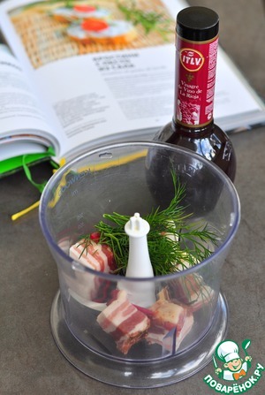 Добавить очищенный зубчик чеснока, нарезанный чили перец, соль, перец ч. м., розмарин, белый винный уксус, кориандр и укроп.