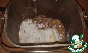 Все ингредиенты кроме кунжута, шоколада и финиками положить в ведерко хлебопечки и установить режим "Выпечка с изюмом"