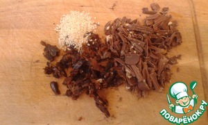 В это время порезать финики и шоколад небольшими кусочками, приготовить кунжут. После звукового сигнала засыпать данные ингредиенты