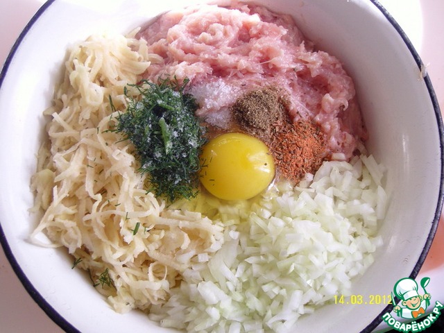 • Картофель сырой натереть на крупной терке. Картофель и фарш смешать с луком, яйцом, зеленью (у меня замороженный укроп). Соль и приправы добавить по вкусу.