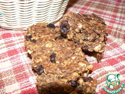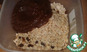 В овсяные хлопья добавить изюм (воду предварительно слить), орехи, измельченные до небольших кусочков и финиковую смесь