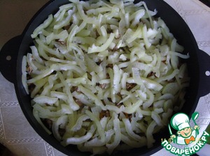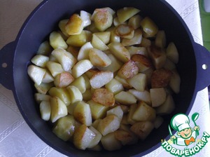 Картофель обжарить до полуготовности на сковороде, выложить в казан (утятницу, горшочек).
