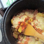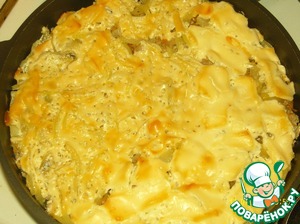Залить подсоленным молоком. Поставить казанок в духовку на 20-25 минут. Когда сыр расплавится, все перемешать и подавать к столу